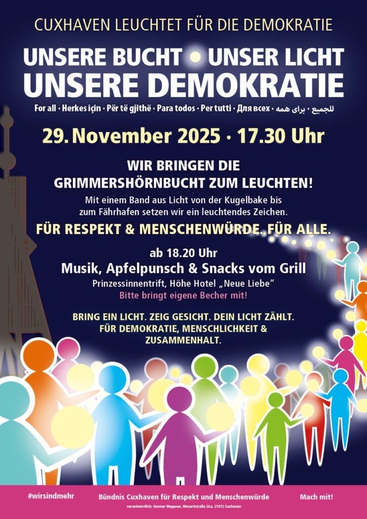 Lichterkette am Samstag, 29. November: Das Bündnis für Respekt und Menschenwürde ruft an diesem Tag zu einer Lichterkette auf. Wer gemeinsam mit dem OHA teilnehmen möchte: Wir stehen in der Grimmershörnbucht auf Höhe des Kurparks.
